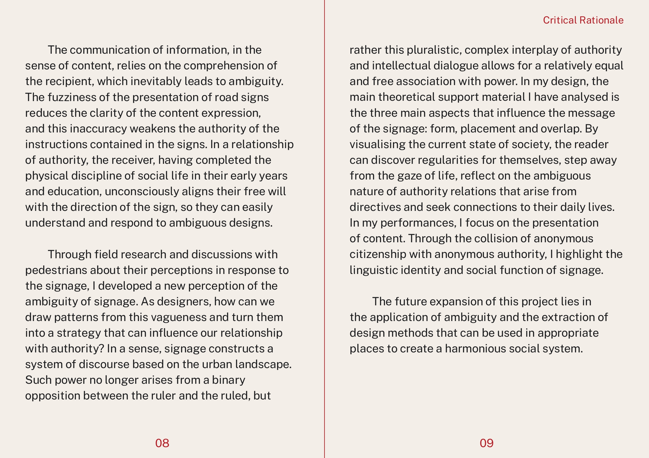 The communication of information, in the sense of content, relies on the comprehension of the recipient, which inevitably leads to ambiguity. The fuzziness of the presentation of road signs reduces the clarity of the content expression, and this inaccuracy weakens the authority of the instructions contained in the signs. In a relationship of authority, the receiver, having completed the physical discipline of social life in their early years and education, unconsciously aligns their free will with the direction of the sign, so they can easily understand and respond to ambiguous designs. As a type of public message, researchers have articulated perspectives on the expression of this message within the scope of linguistics, pragmatics and cognition, whereas I extend it to the field of graphic media to address the visual elements that influence the effectiveness of signage conveyances.